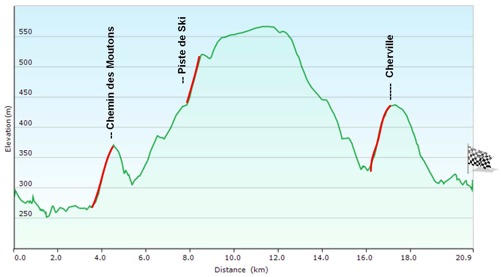 Si les contractures m’empêchent d’accélérer là où je le voudrais, elle ne me forcent heureusement pas à m’arrêter. J’arrive au pied de l’ultime difficulté du jour, la Côte de Cherville. Un kilomètre à 10 % de moyenne, les passages les plus raides entre 15 et 20 %. Des 3 ascensions du jour, c’est celle qui évoque le plus un parcours trail : étroite, sinueuse et à travers bois, on peut difficilement s’y dépasser. Résultat, je la monte très lentement, à l’allure de ceux qui me précèdent. Le sommet coïncide avec la marque des 17 km. Je regarde une deuxième fois la montre : 1h44. Terminer en moins de 2 heures est devenu difficile, mais pas encore impossible.