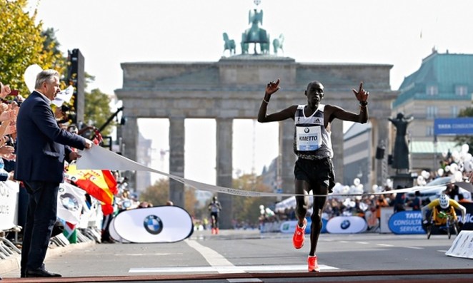 Denis Kimetto franchit la ligne du marathon de Berlin 2014 – crédit photo : Boris Streubel / Bongarts / Getty