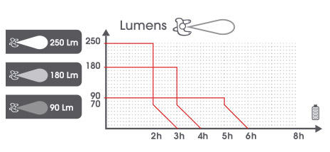 - 3 intensités lumineuses : 90 Lumens, 180 Lumens et 250 Lumens ;