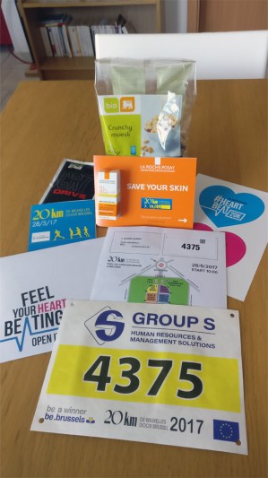 Cette année, le dossard est accompagné d’un paquet de céréales bio (mon petit déjeuner traditionnel le matin d’une course), d’une préparation pour boisson de l’effort, d’un tube de crème solaire haute protection, de bons d’achat pour les produits Delhaize bio et Spa ainsi que d’autocollants Garmin. Quatre épingles de sûreté sont fournies.