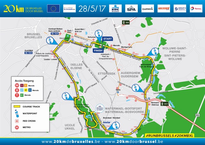 La course est organisée chaque année le dernier dimanche de mai, ou l’avant-dernier en cas d’élections. En Belgique, mai est le mois le plus ensoleillé de l’année. La normale mensuelle des maxima est de 18 °C. Le 21 mai 2014, la température maximale relevée à Uccle était de 20,7°C ; elle était de 15,9°C le 31 mai 2015 et 18,4°C le 29 mai 2016. Ça n’a l’air de rien, pourtant j’ai eu chaud durant les trois éditions auxquelles j’ai participé. Cette année, on annonce jusqu’à (plus de) 30°C. Prévoyez des vêtements respirants de couleur claire et une casquette. Prenez le temps de vous hydrater à chaque ravitaillement (voir lettre H). Chaleur, humidité et rayonnement solaire sont des ennemis de la performance : le maintien de la température corporelle mobilise des ressources physiologiques au détriment de l’effort. Gardez en tête ce conseil prodigué par la Croix-Rouge : « Il convient d’adapter son objectif et d’accepter de ne pas atteindre son temps de référence (…) mieux vaut arriver sur ses deux jambes dix minutes après son temps de référence que plus vite, mais sur une civière. » Heureusement, depuis 2012, les 20km de Bruxelles se courent en matinée !