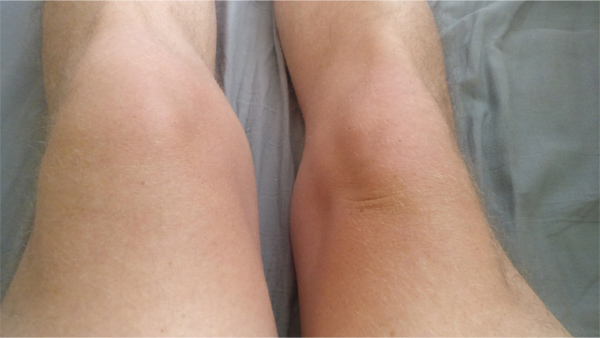 Un bel épanchement, mon genou gauche a doublé de volume malgré la glace et la surélévation.