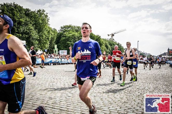 Je suis content d’arriver au bout. J’aperçois les Arcades du Cinquantenaire et je donne tout ce qu’il me reste pour les 500 derniers mètres. Un petit coucou (cœur avec les doigts) à la caméra et je stoppe mon chrono à 01:36:02. Quand je repense à mon début de course, jamais je n’aurais cru atteindre ce chrono. Je suis pleinement satisfait.